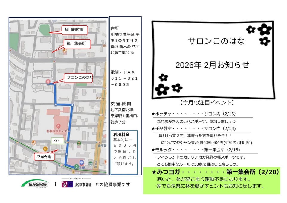 会場:このはな(札幌市豊平区平岸1条5丁目2番地新木の花団地第1集会場)